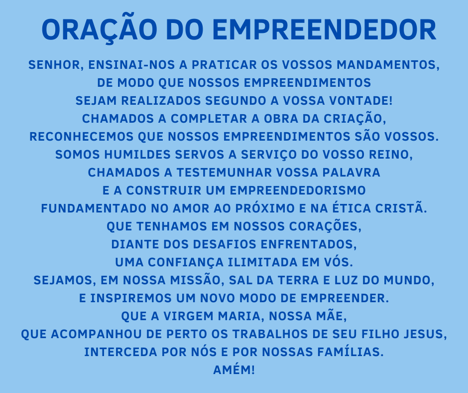 Senhor, ensinai-nos a praticar os vossos mandamentos, de modo que nossos empreendimentos sejam realizados segundo a Vossa vontade! Chamados a completar a obra da criação, reconhecemos que nossos empreendimentos são vossos. Somos humildes servos a serviço do vosso Reino, chamados a testemunhar vossa Palavra e a construir um empreendedorismo fundamentado no amor ao próximo e na ética cristã. Que tenhamos em nossos corações, diante dos desafios enfrentados, uma confiança ilimitada em Vós. Sejamos, em nossa missão, sal da terra e luz do mundo, e inspiremos um novo modo de empreender. Que a Virgem Maria, nossa Mãe, que acompanhou de perto os trabalhos de seu Filho Jesus, interceda por nós e por nossas famílias.